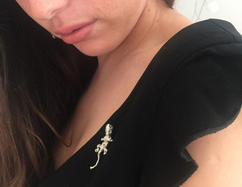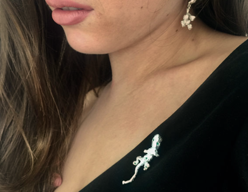 Esta joya es una verdadera obra de arte, realizada con una salamandra natural. Utilizando el método de la cera perdida. La salamandra se transforma en metal, específicamente en plata 925, conservando cada detalle de su forma única. Esta pieza es versátil, sirviendo como dije colgante y broche. Su sistema de alfiler con tope la convierte en un elegante broche, mientras que una argolla colgante escondida permite usarla como dije. Además, cuenta con cinco esmeraldas engarzadas a lo largo de su estructura, añadiendo un toque de brillo y color. Su diseño atemporal la hace adecuada para lucirla en cualquier momento del día, especialmente por la noche, donde su elegancia se realza. Con esta joya, llevarás contigo una pieza única que seguramente atraerá todas las miradas.